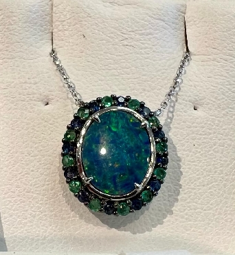 Home/Store/10k white gold opal pendant with sapphire and emerald halo.