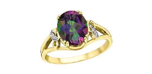 10k yellow gold mystic topaz and diamond ring. 1 mystic topaz 10x8mm 4 fancy cut diamonds 0.02ct Canadian Certified Gold.